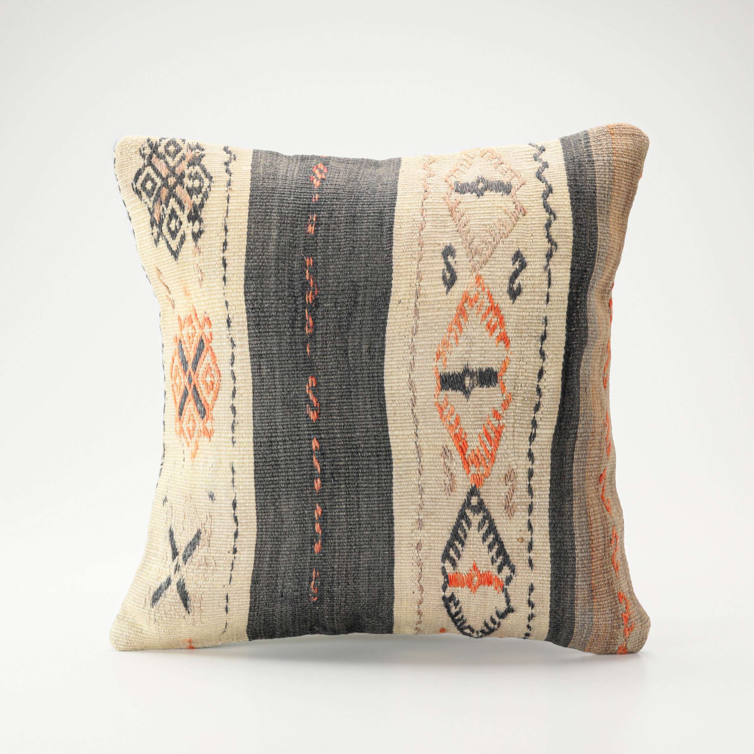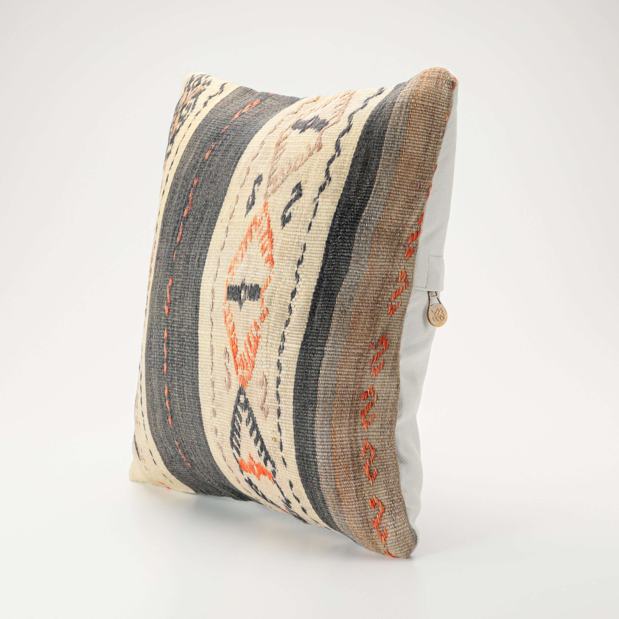 Materials: Handwoven artisan-crafted kilim front. Soft virgin cotton backing. Inlaid soft gold zipper.