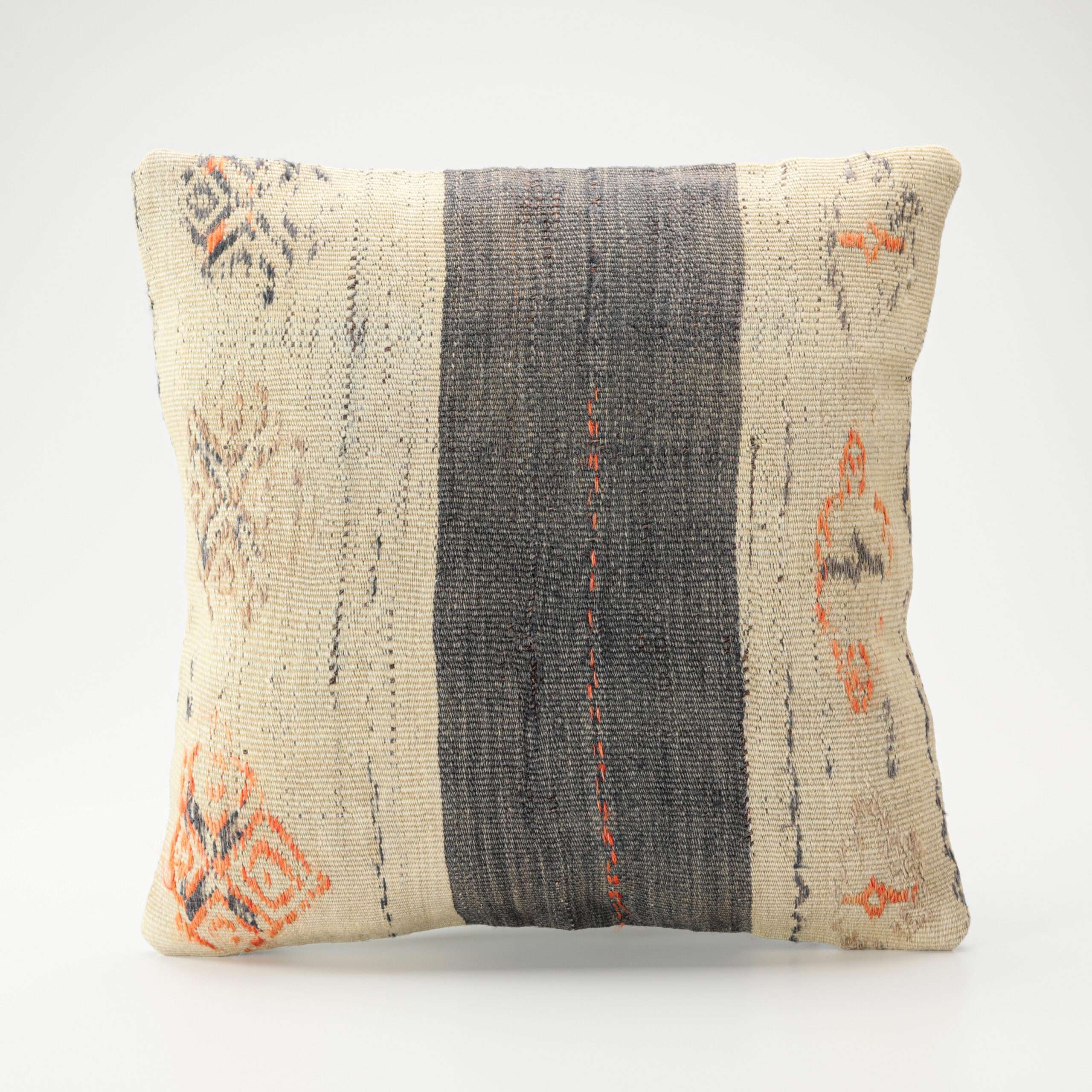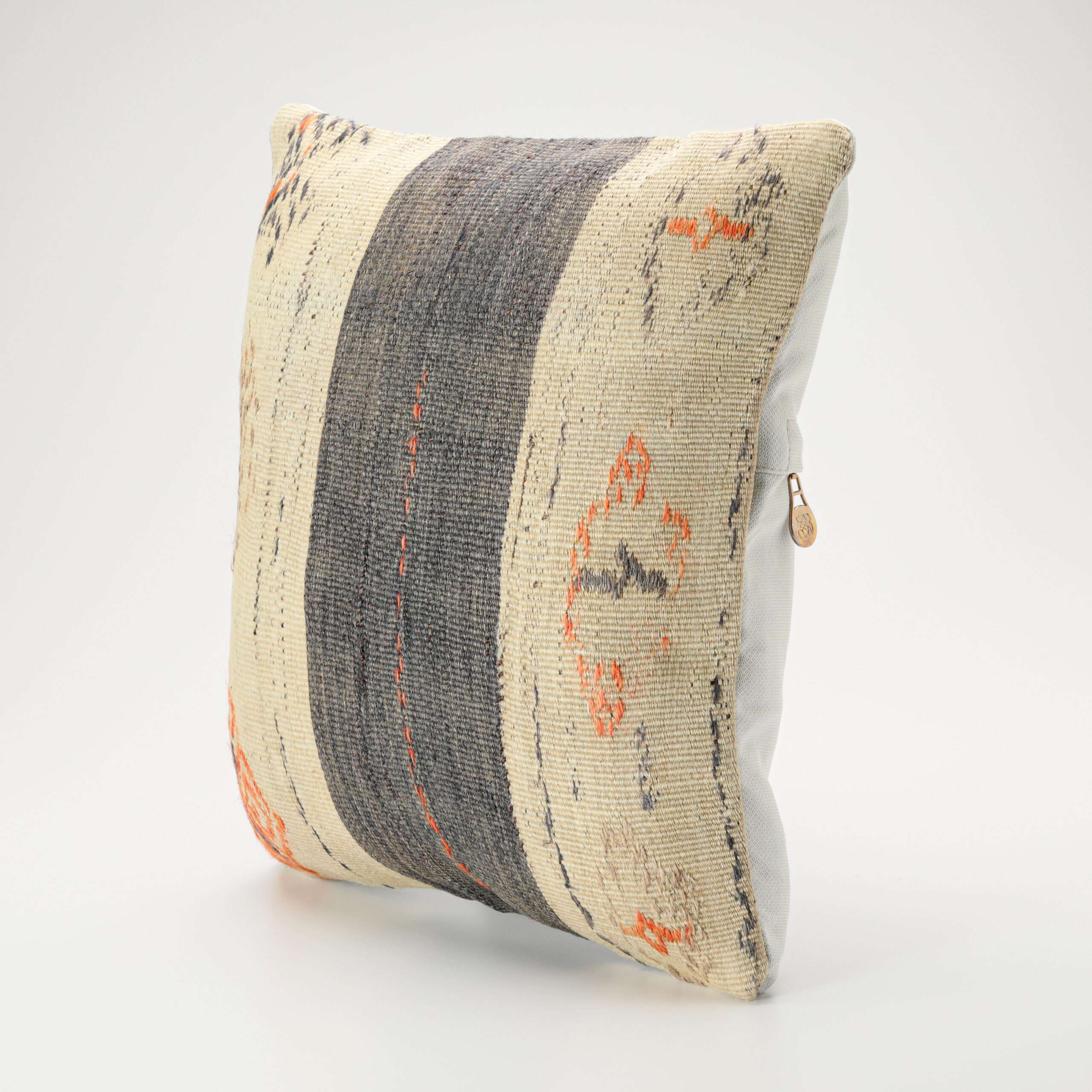 Materials: Handwoven artisan-crafted kilim front. Soft virgin cotton backing. Inlaid soft gold zipper.