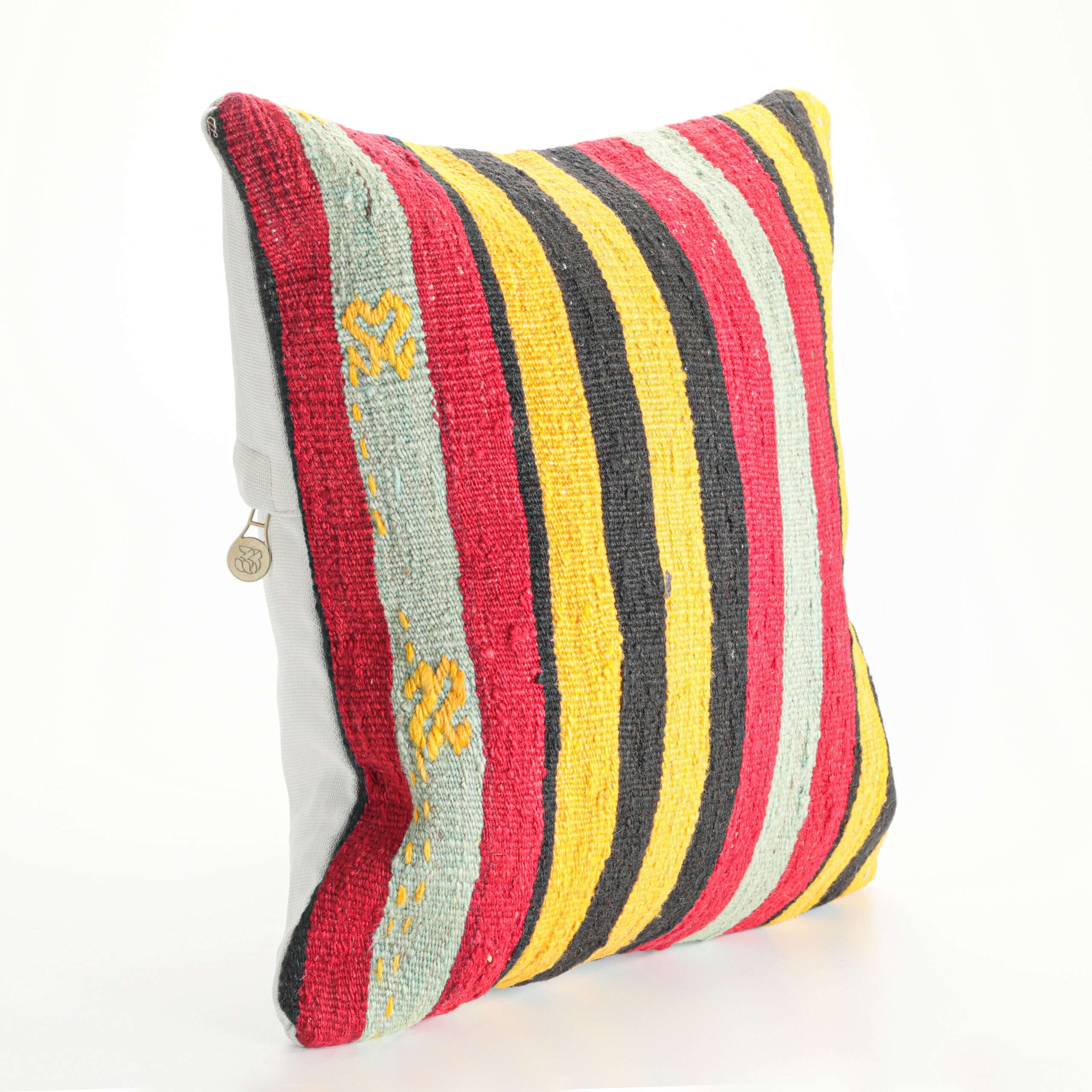 Materials: Handwoven artisan-crafted kilim front. Soft virgin cotton backing. Inlaid soft gold zipper.
