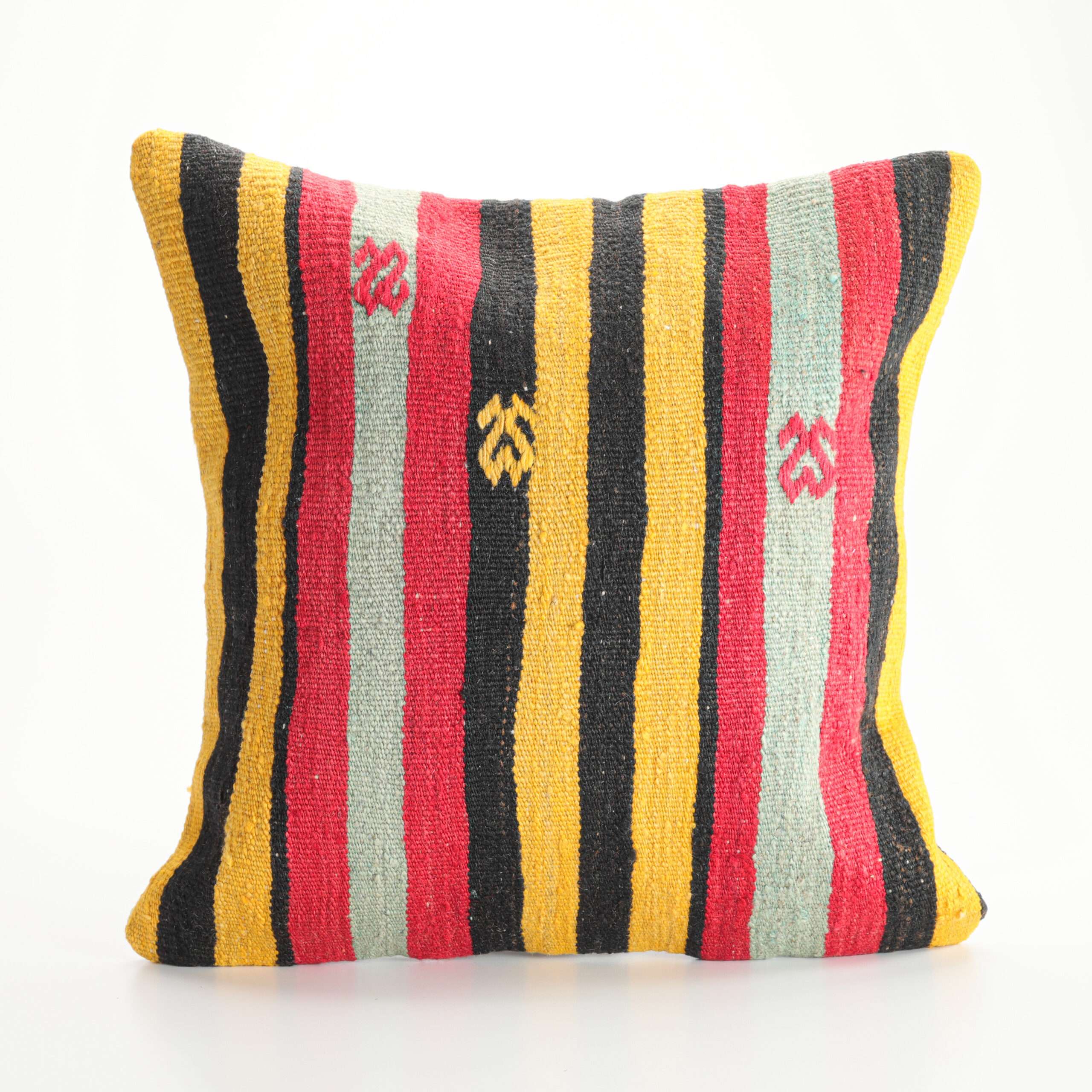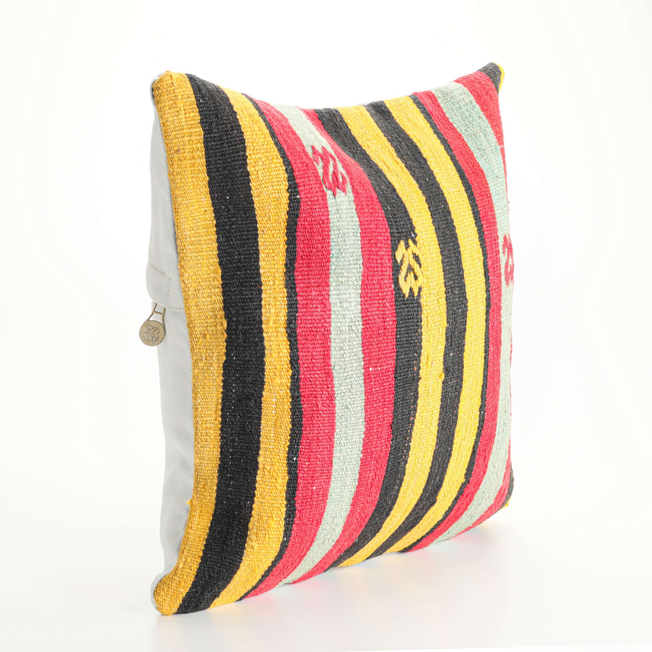 Materials: Handwoven artisan-crafted kilim front. Soft virgin cotton backing. Inlaid soft gold zipper.