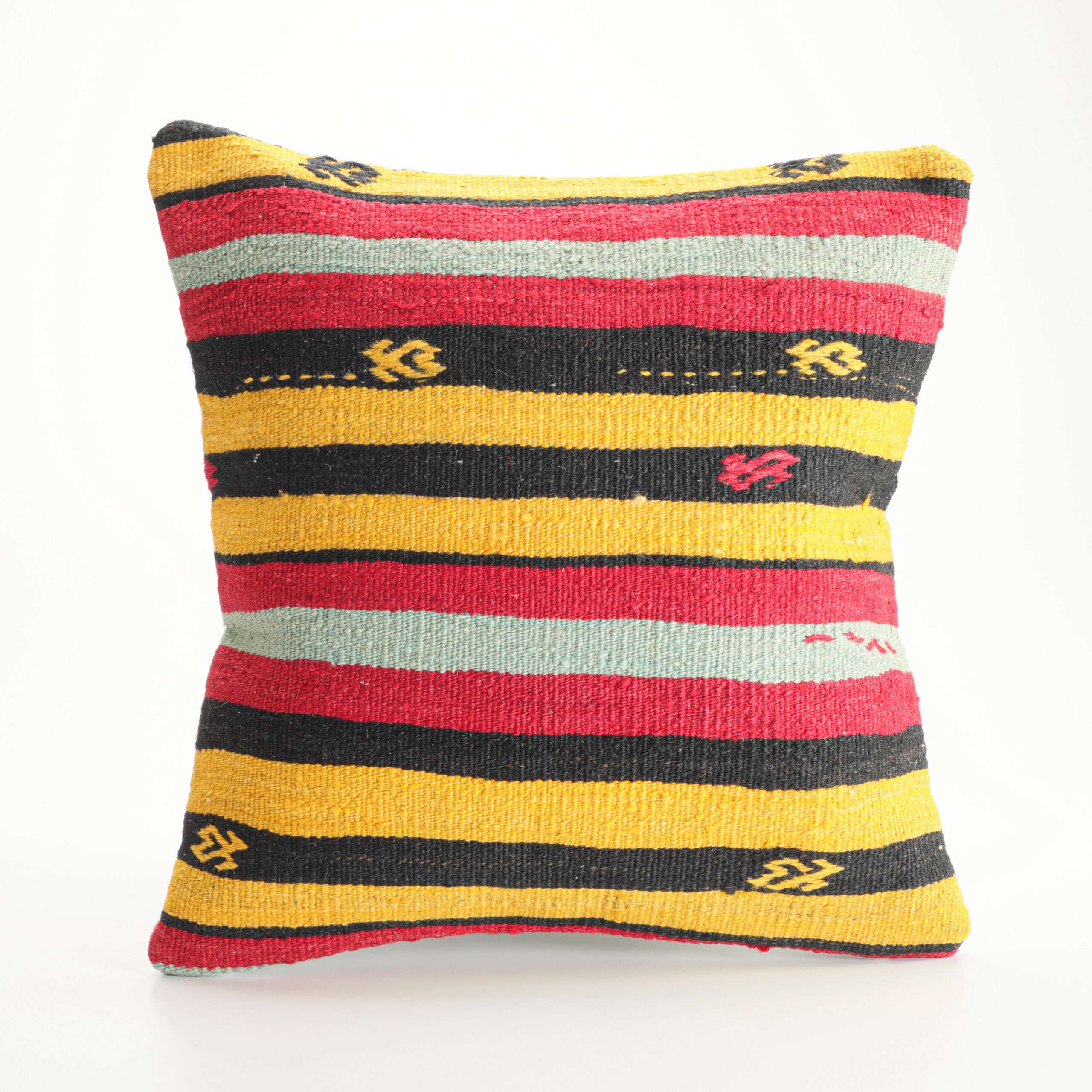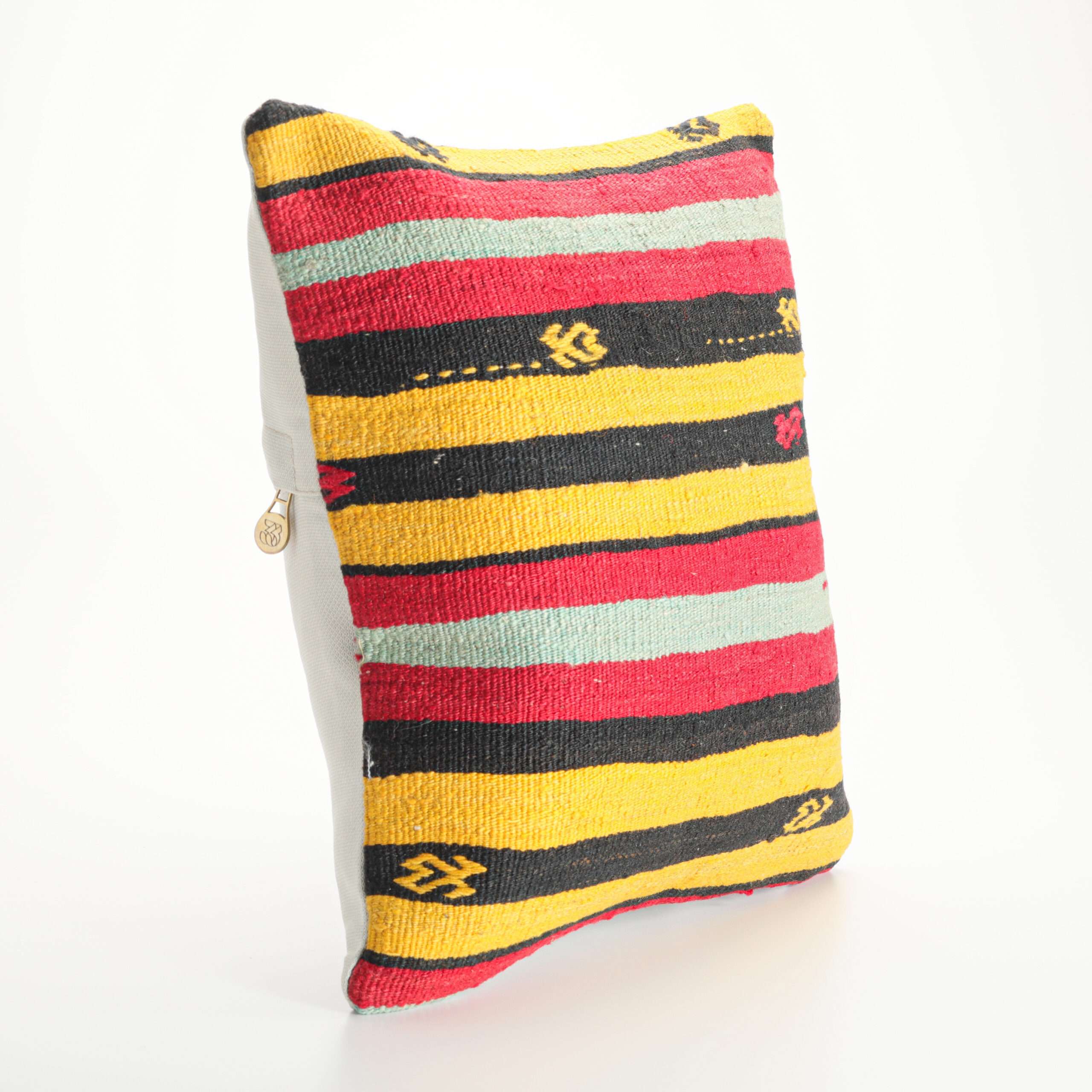 Materials: Handwoven artisan-crafted kilim front. Soft virgin cotton backing. Inlaid soft gold zipper.