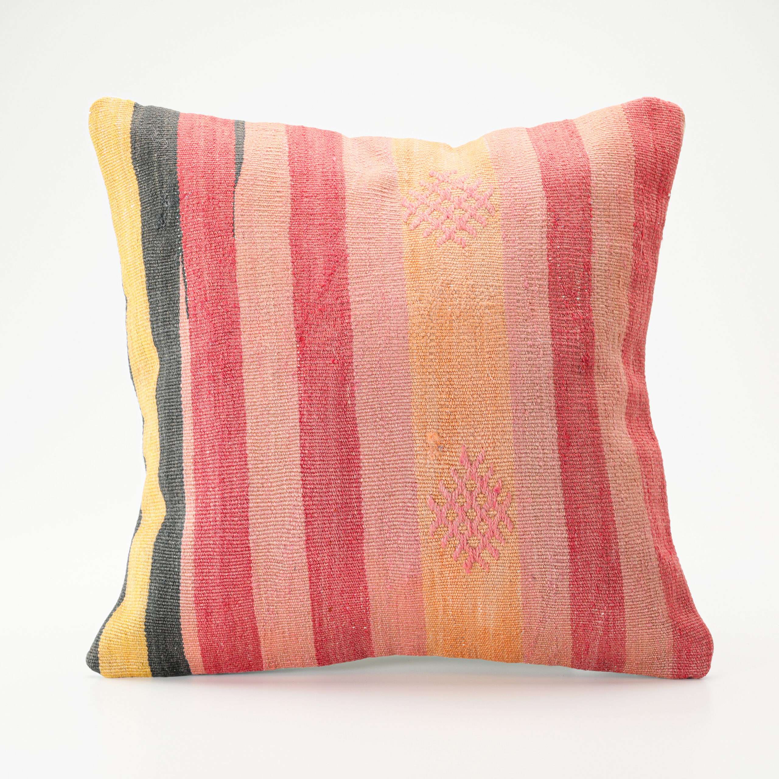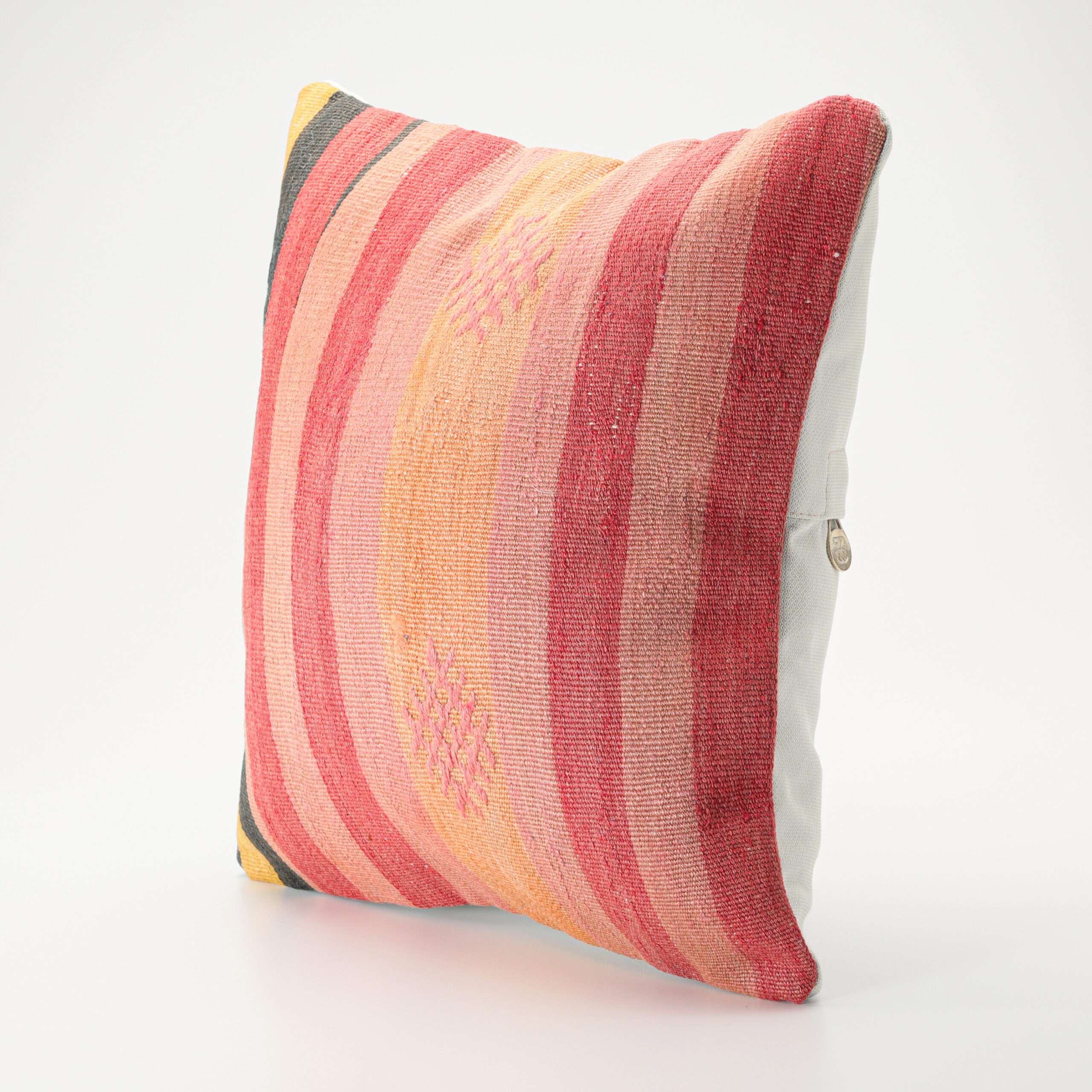Materials: Handwoven artisan-crafted kilim front. Soft virgin cotton backing. Inlaid soft gold zipper.