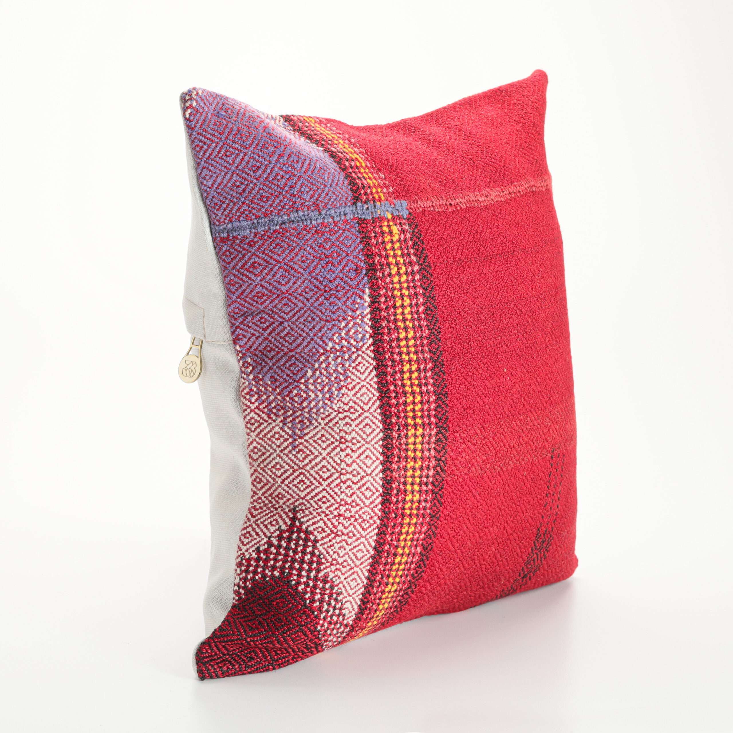 Materials: Handwoven artisan-crafted kilim front. Soft virgin cotton backing. Inlaid soft gold zipper.