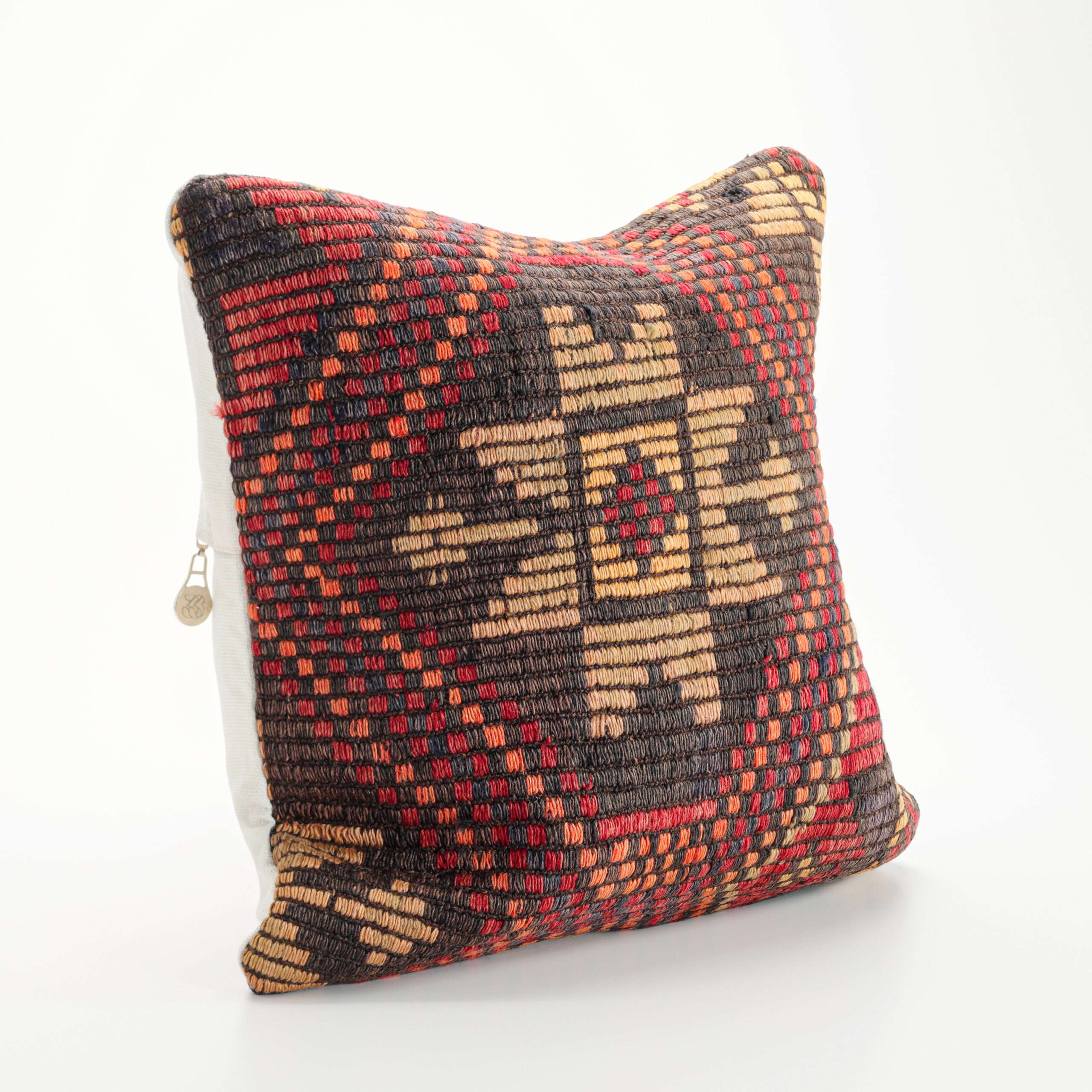 Materials: Handwoven artisan-crafted kilim front. Soft virgin cotton backing. Inlaid soft gold zipper.