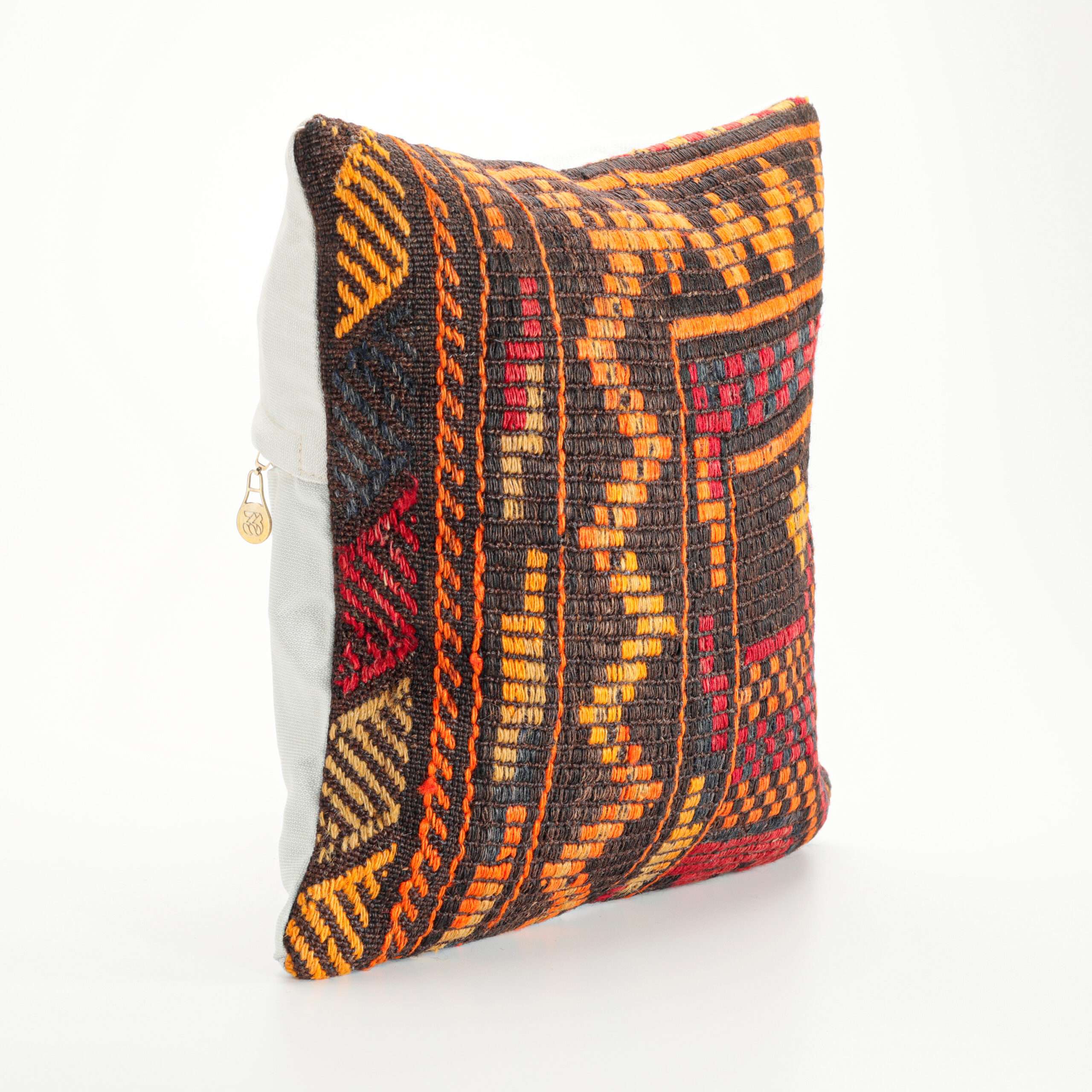 Materials: Handwoven artisan-crafted kilim front. Soft virgin cotton backing. Inlaid soft gold zipper.