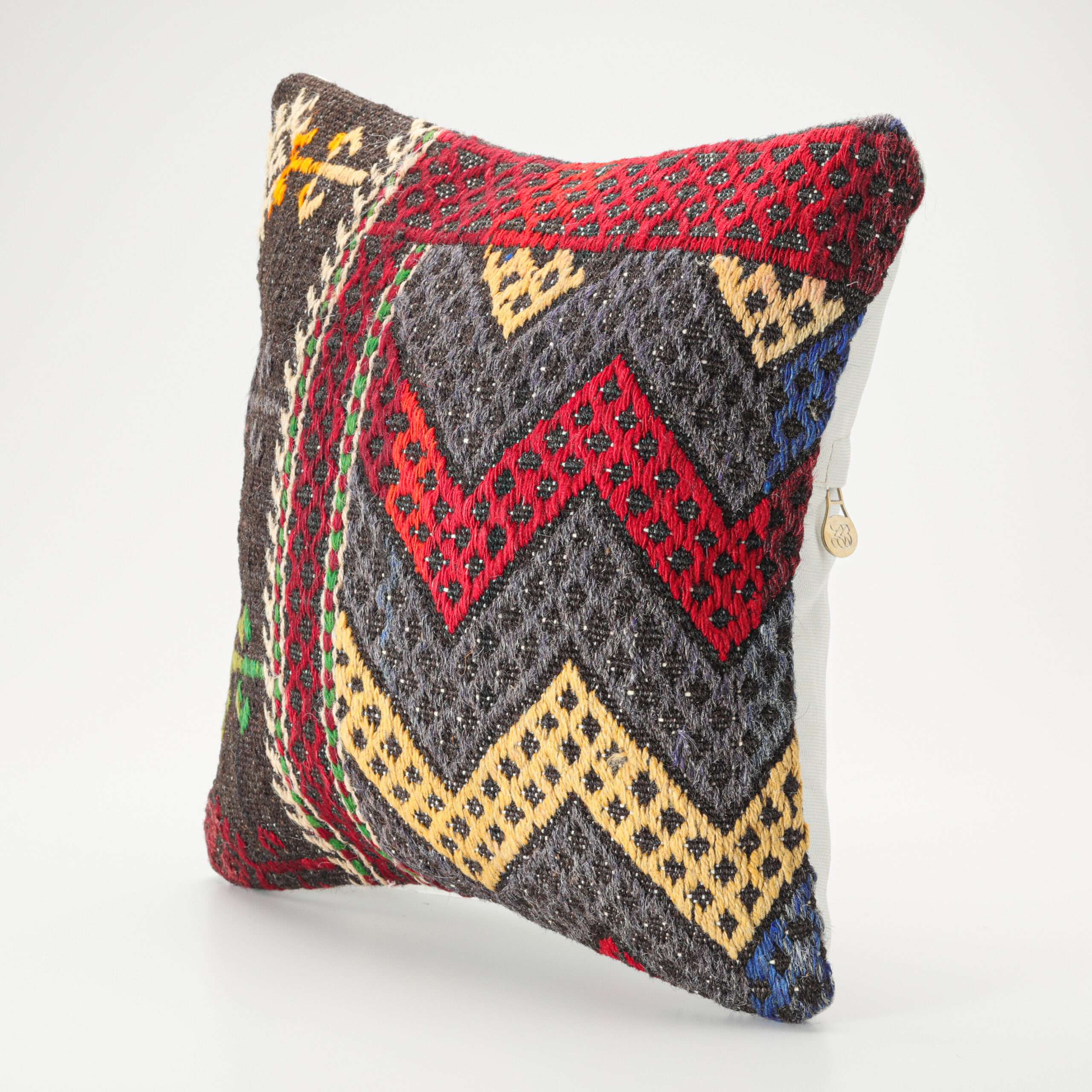 Materials: Handwoven artisan-crafted kilim front. Soft virgin cotton backing. Inlaid soft gold zipper.