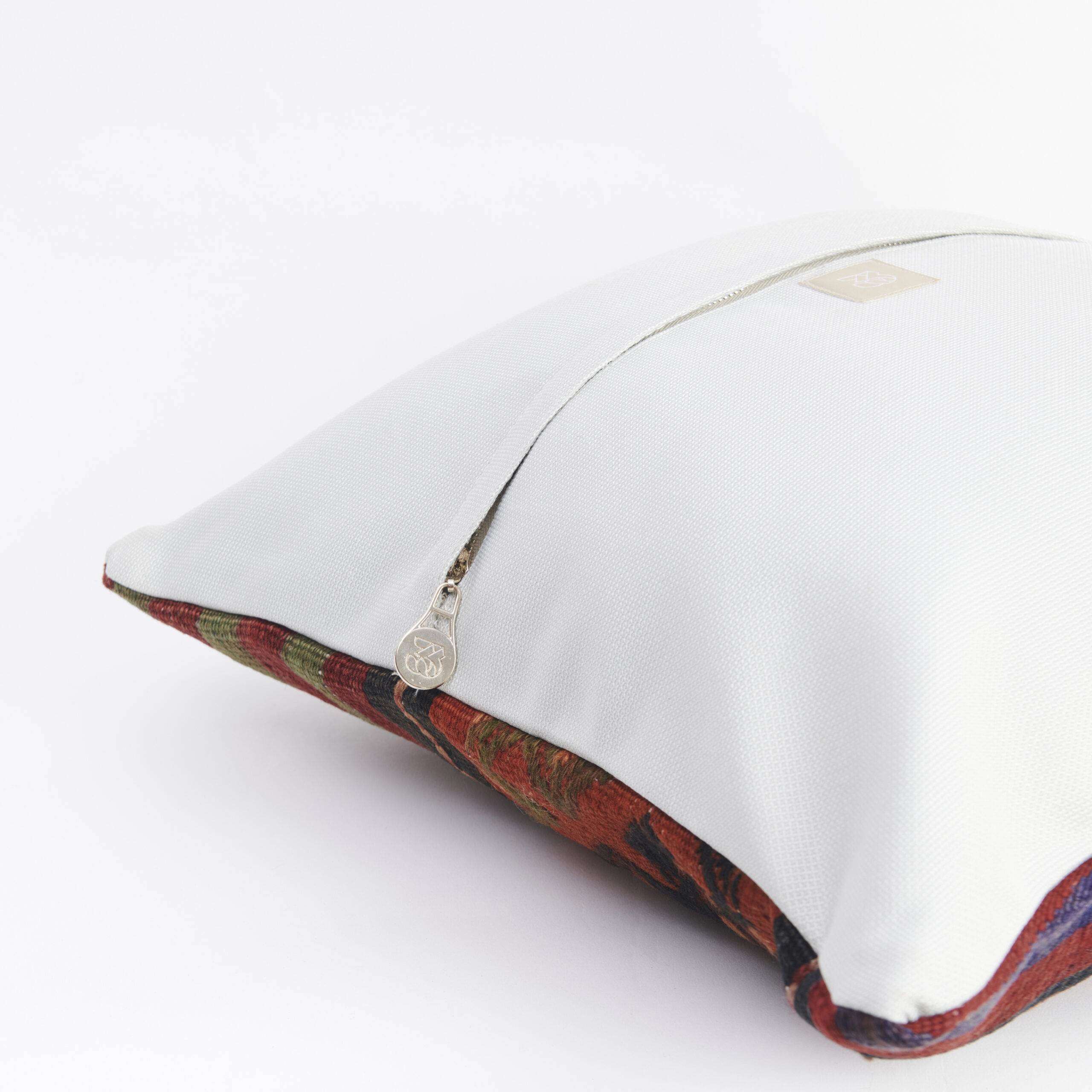 Materials: Handwoven artisan-crafted kilim front. Soft virgin cotton backing. Inlaid soft gold zipper.