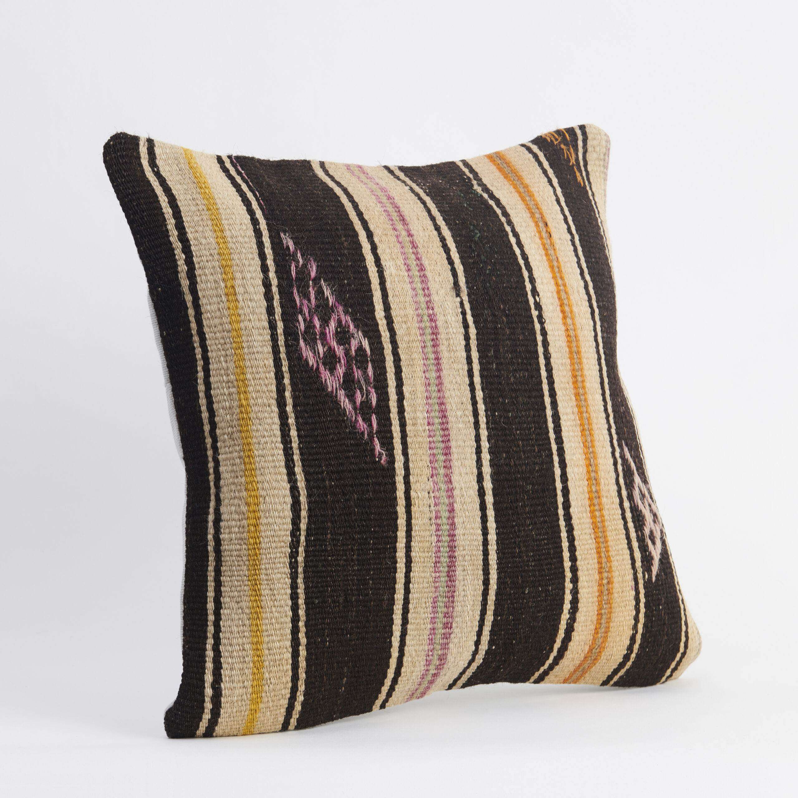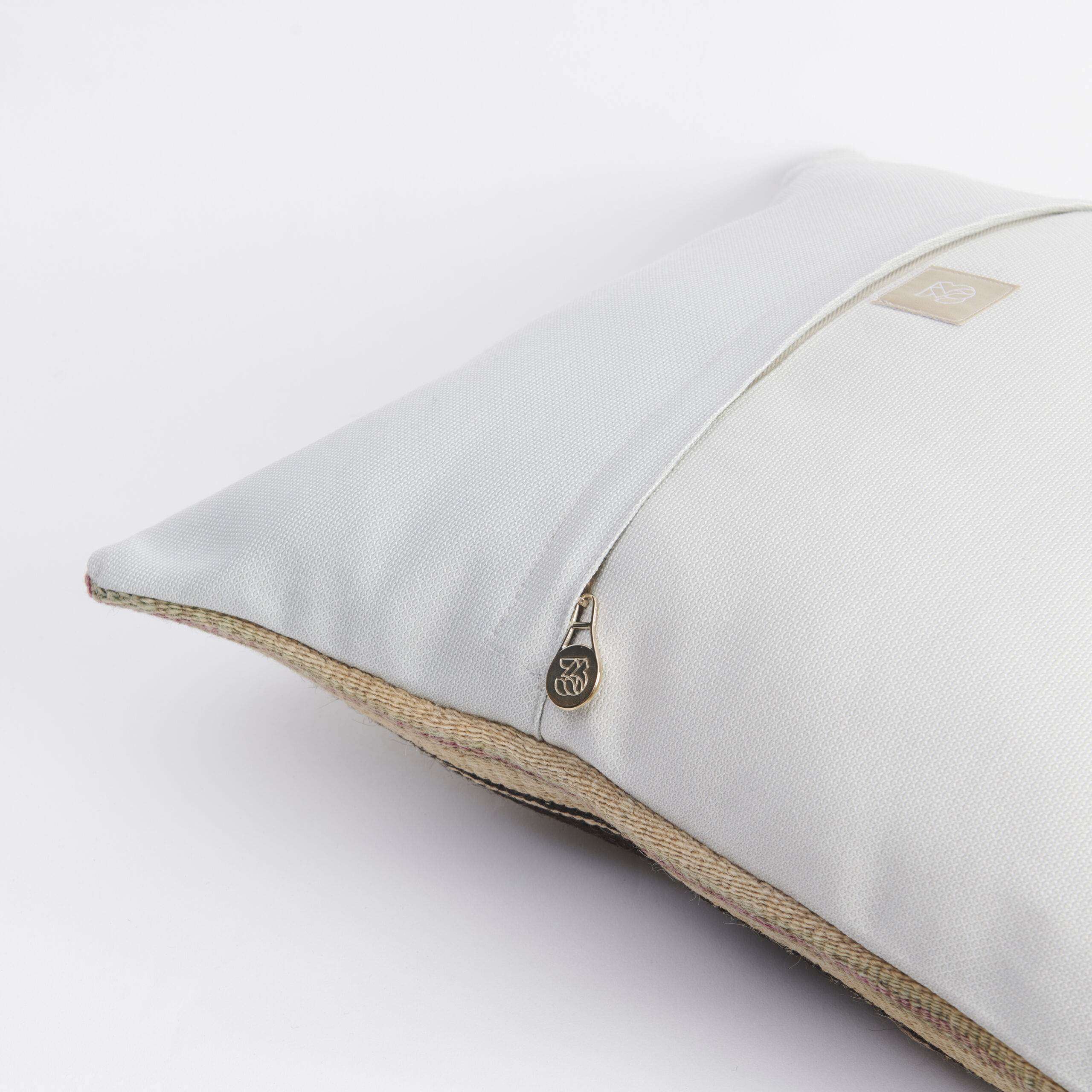 Materials: Handwoven artisan-crafted kilim front. Soft virgin cotton backing. Inlaid soft gold zipper.