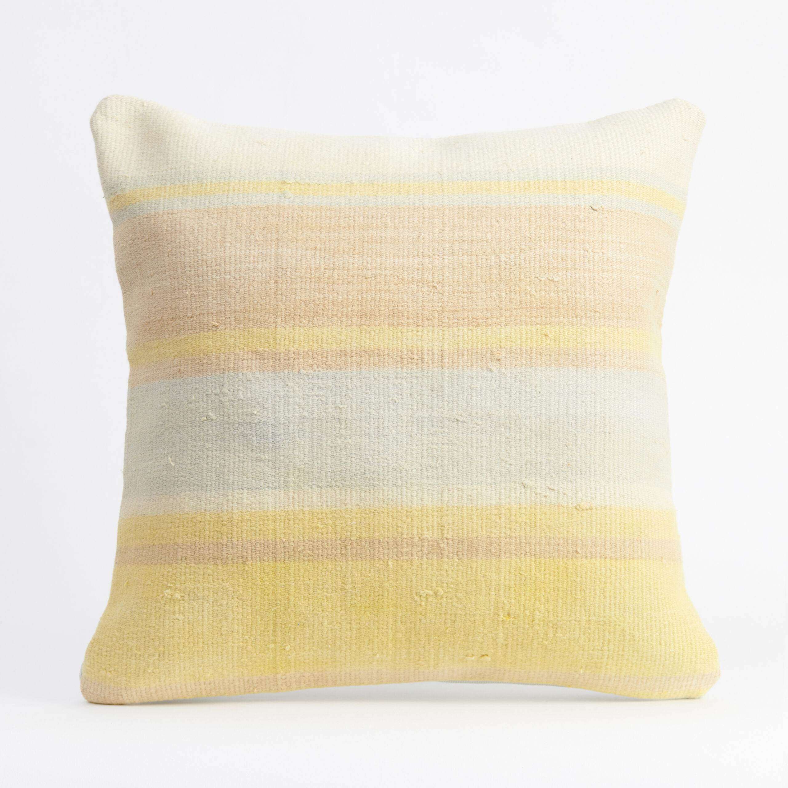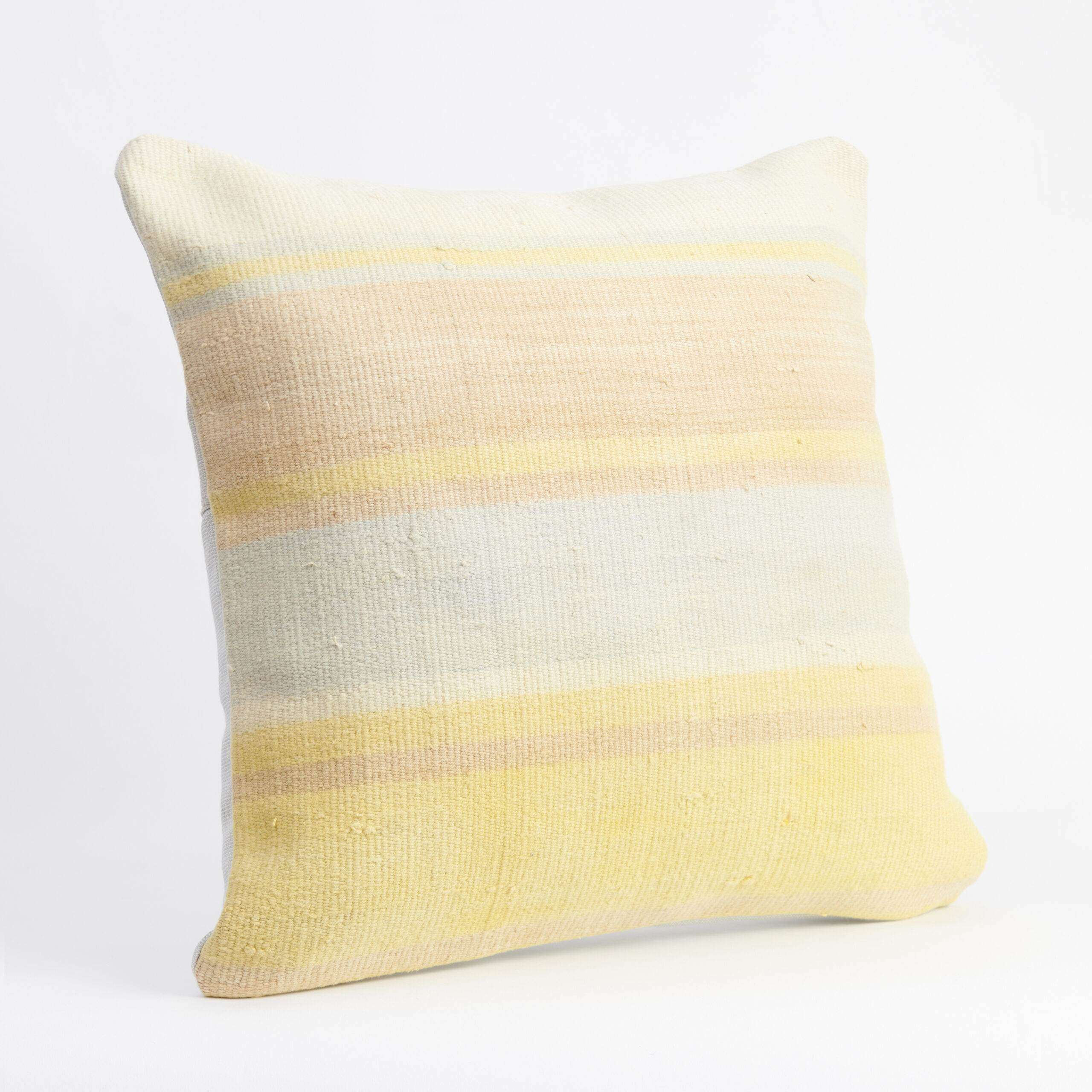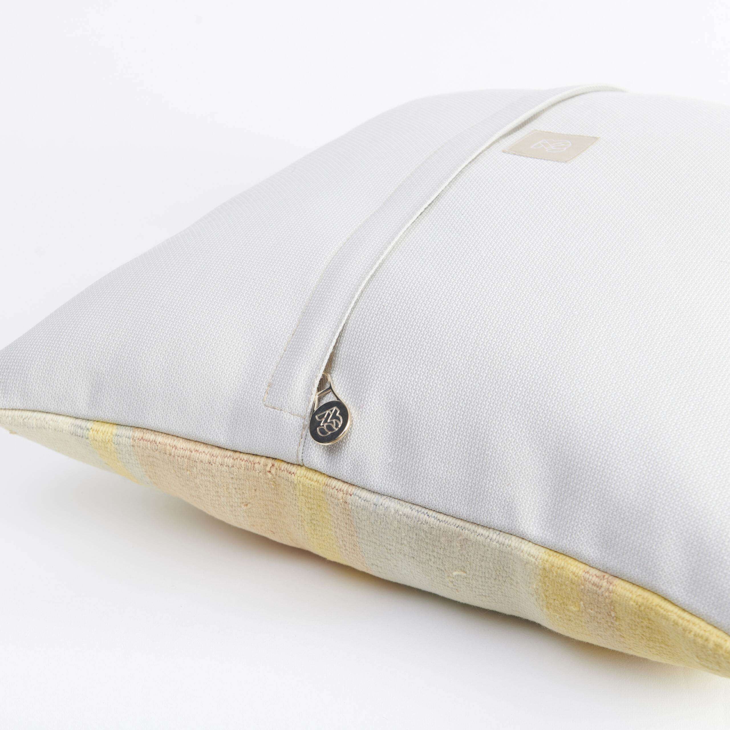 Materials: Handwoven artisan-crafted kilim front. Soft virgin cotton backing. Inlaid soft gold zipper.