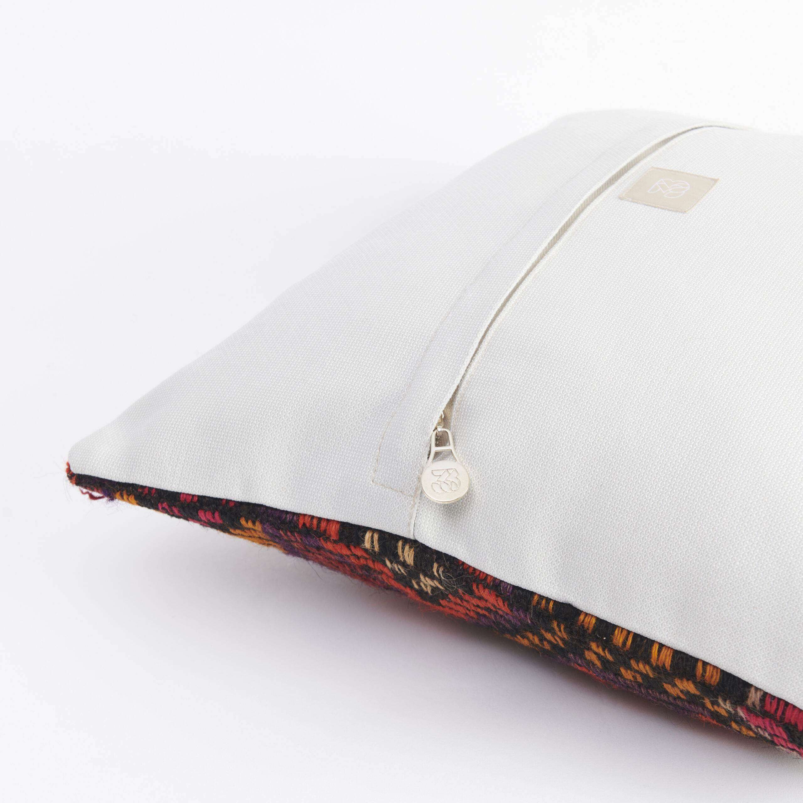 Materials: Handwoven artisan-crafted kilim front. Soft virgin cotton backing. Inlaid soft gold zipper.