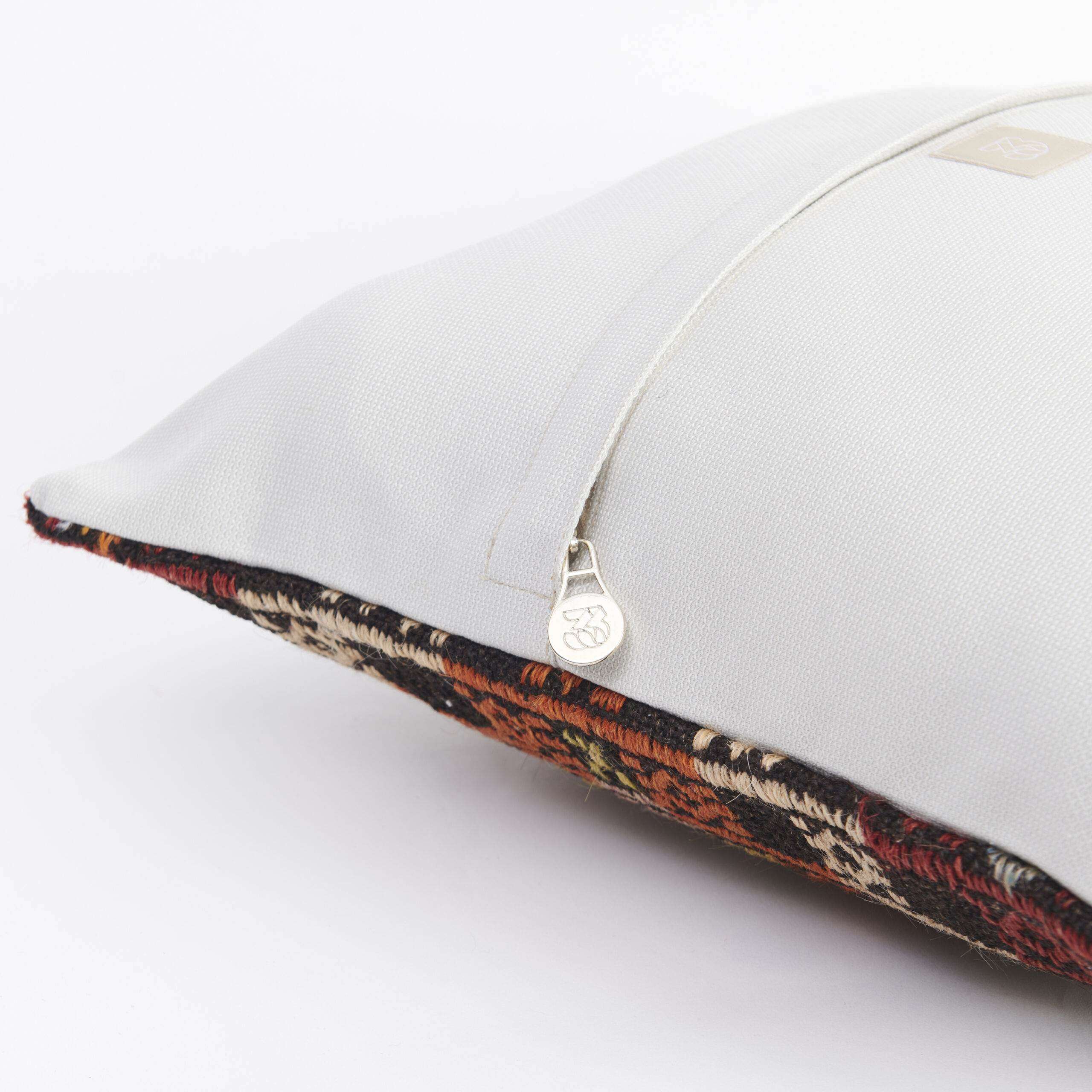 Materials: Handwoven artisan-crafted kilim front. Soft virgin cotton backing. Inlaid soft gold zipper.